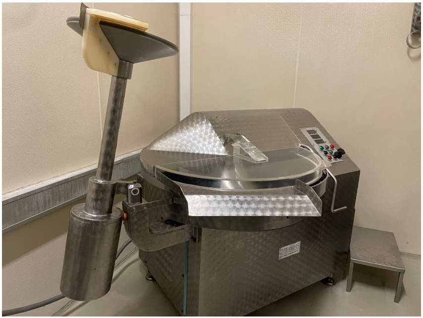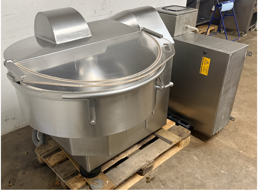 Completamente fabricada en acero inoxidable, con expulsor, capacidad del recipiente de 100 litros, velocidad de la cuchilla y ciclos de mezcla con regulación continua, conexión de 400 V, motor principal de 35 kW, peso aproximado: 1750 kg,